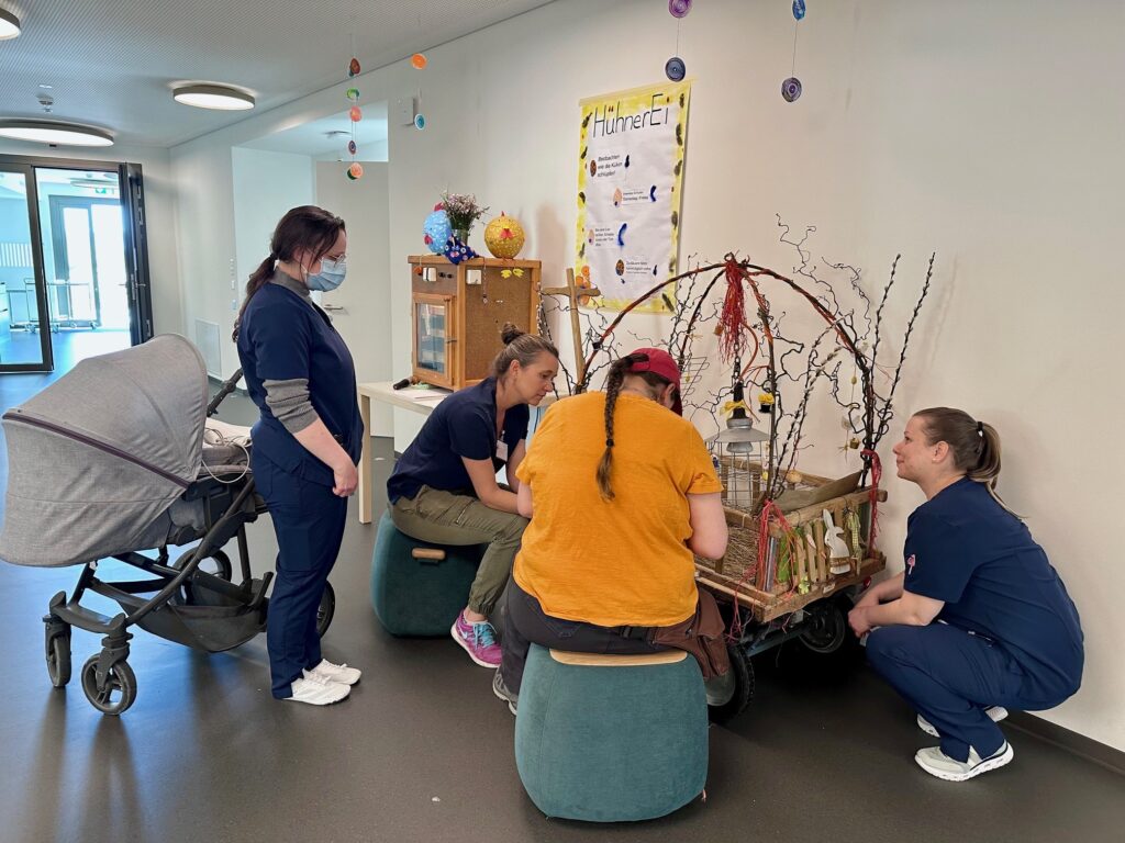 Am Freitagvormittag sitzen Kinder, Eltern und Pflegekräfte dicht beieinander und blicken gespannt auf einen hölzernen Kasten mit Glasscheibe im Erdgeschoss der Gästeetage. Darin liegen 20 befruchtete Eier verschiedener Hühnerrassen – sogenannte «Farbleger». Daneben steht ein liebevoll geschmücktes «Zugwägeli», ausgelegt mit Heu und ausgestattet mit einer Wärmelampe – das künftige Gehege für die kleinen Küken.