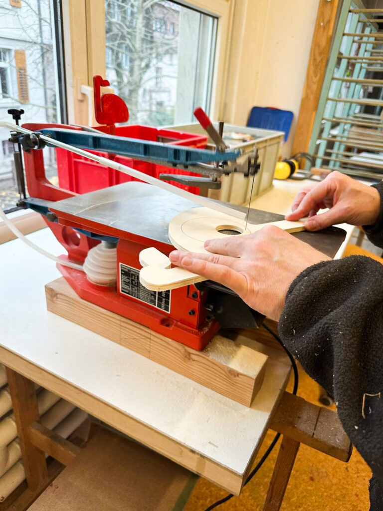 Der präzise Umgang mit der Dekupiersäge verlangt höchste Konzentration und grösste Sorgfalt – vor allem beim Innenkreis, dem „Bauch“ des Flamingos. Gerade diese feinen Details machen jede Form zu etwas Besonderem. Für Kurt Flach war es eine grosse Freude, etwas Neues und Sinnvolles für das Kinderhospiz zu gestalten. Mit einem Lächeln sagt er: „Im Flamingo würde ich gerne mal Urlaub machen!“
